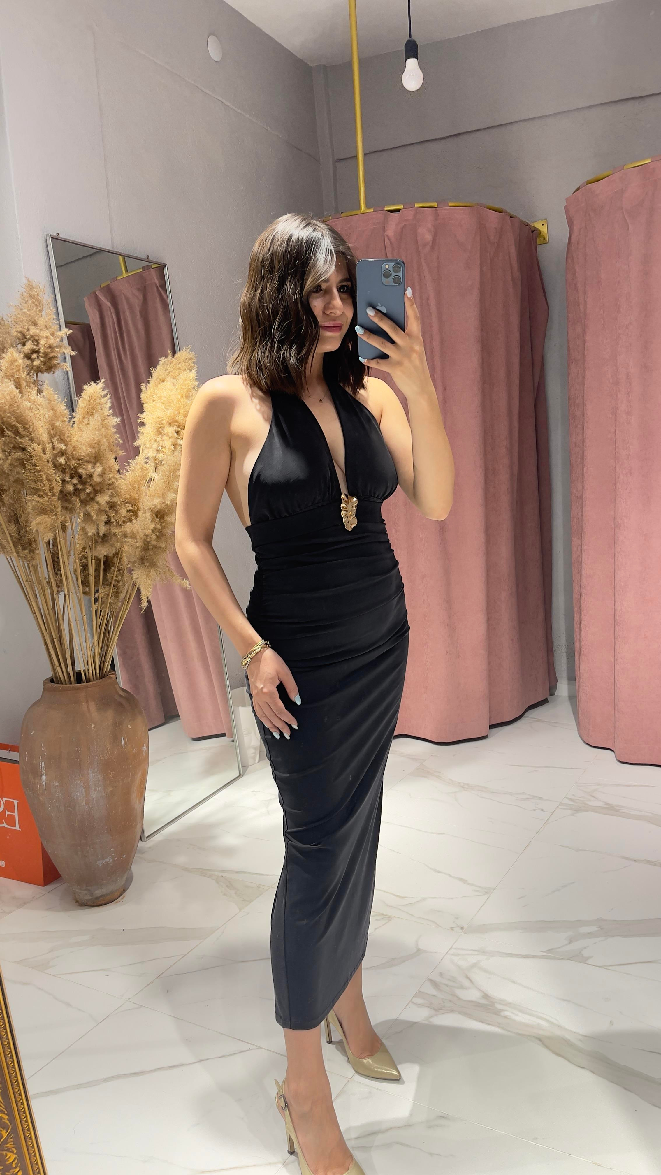 AKSESUARLI SIRT DEKOLTELİ SİYAH MİDİ ELBİSE