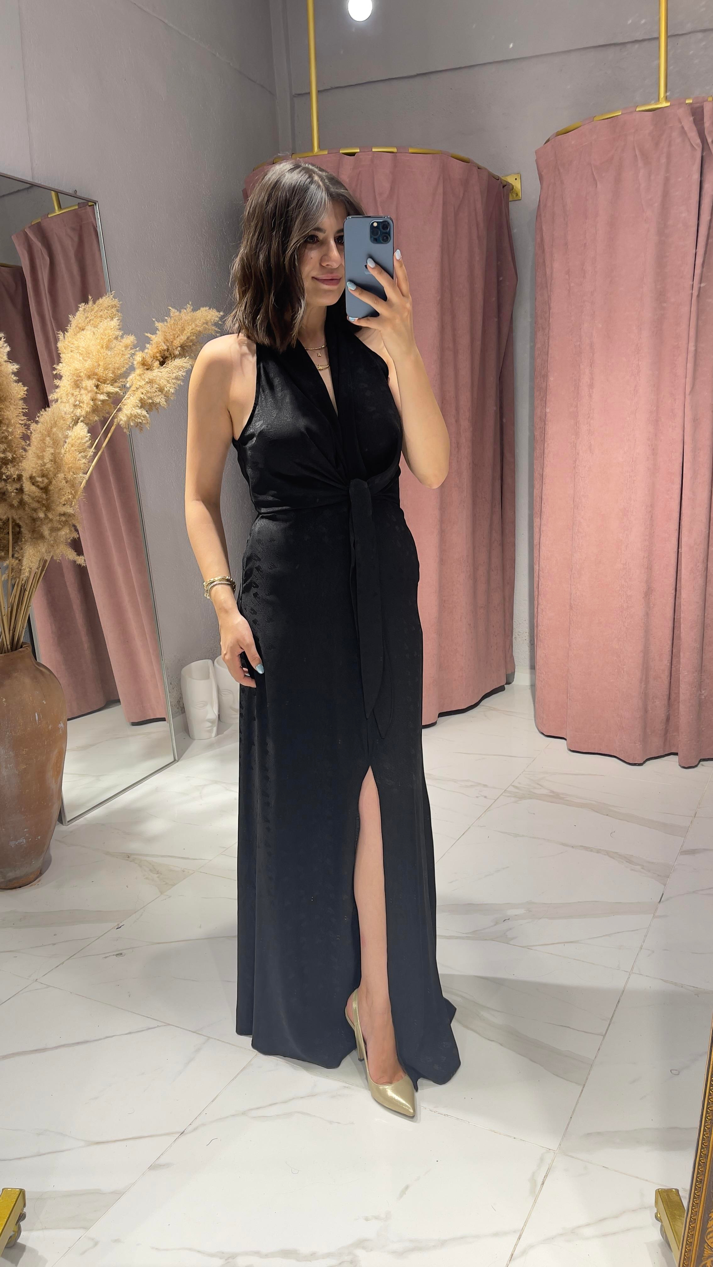 BAĞLAMALI ÖN YIRTMAÇLI SİYAH ELBİSE