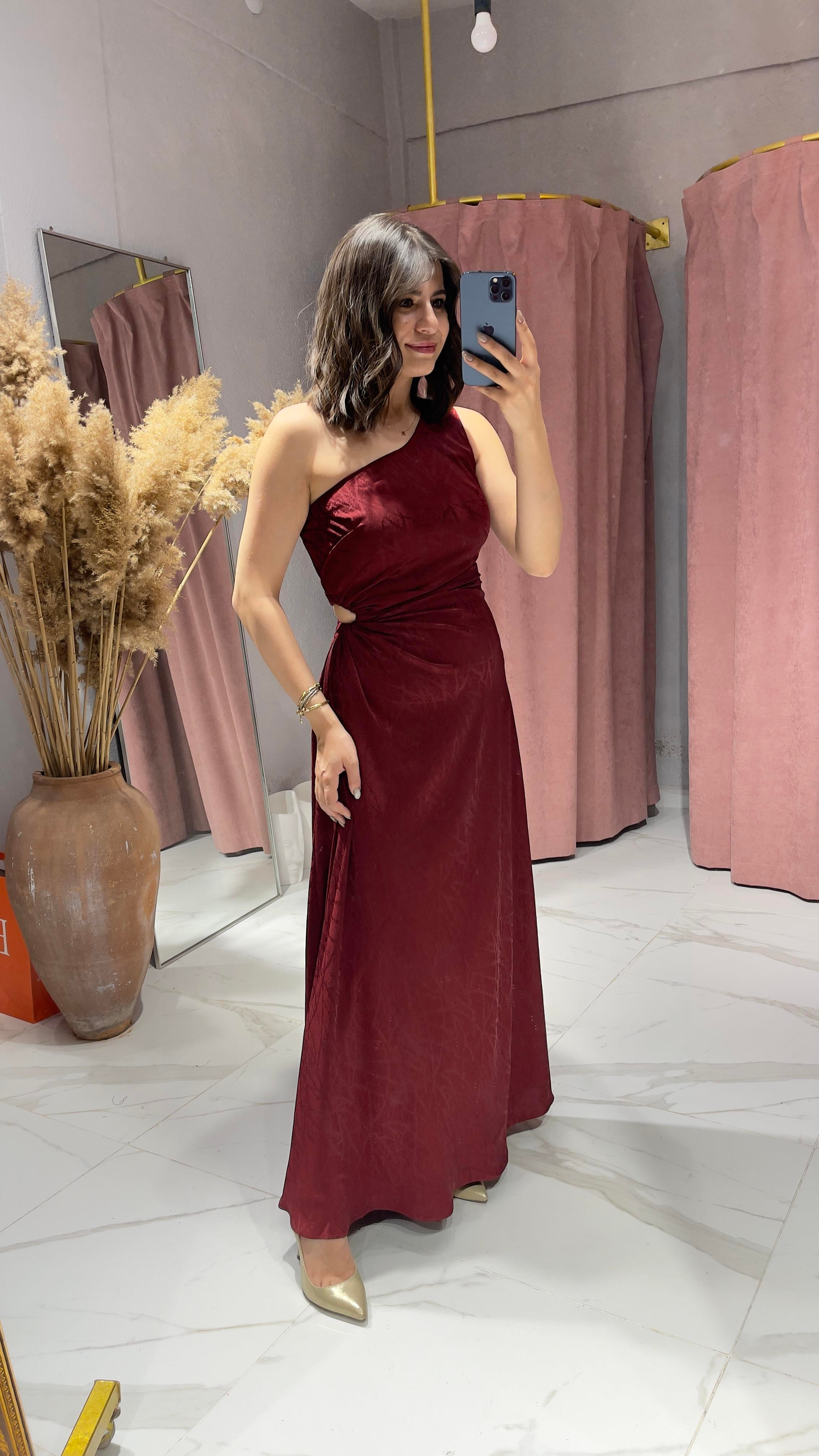 BEL DEKOLTELİ TEK OMUZ BORDO SATEN ELBİSE