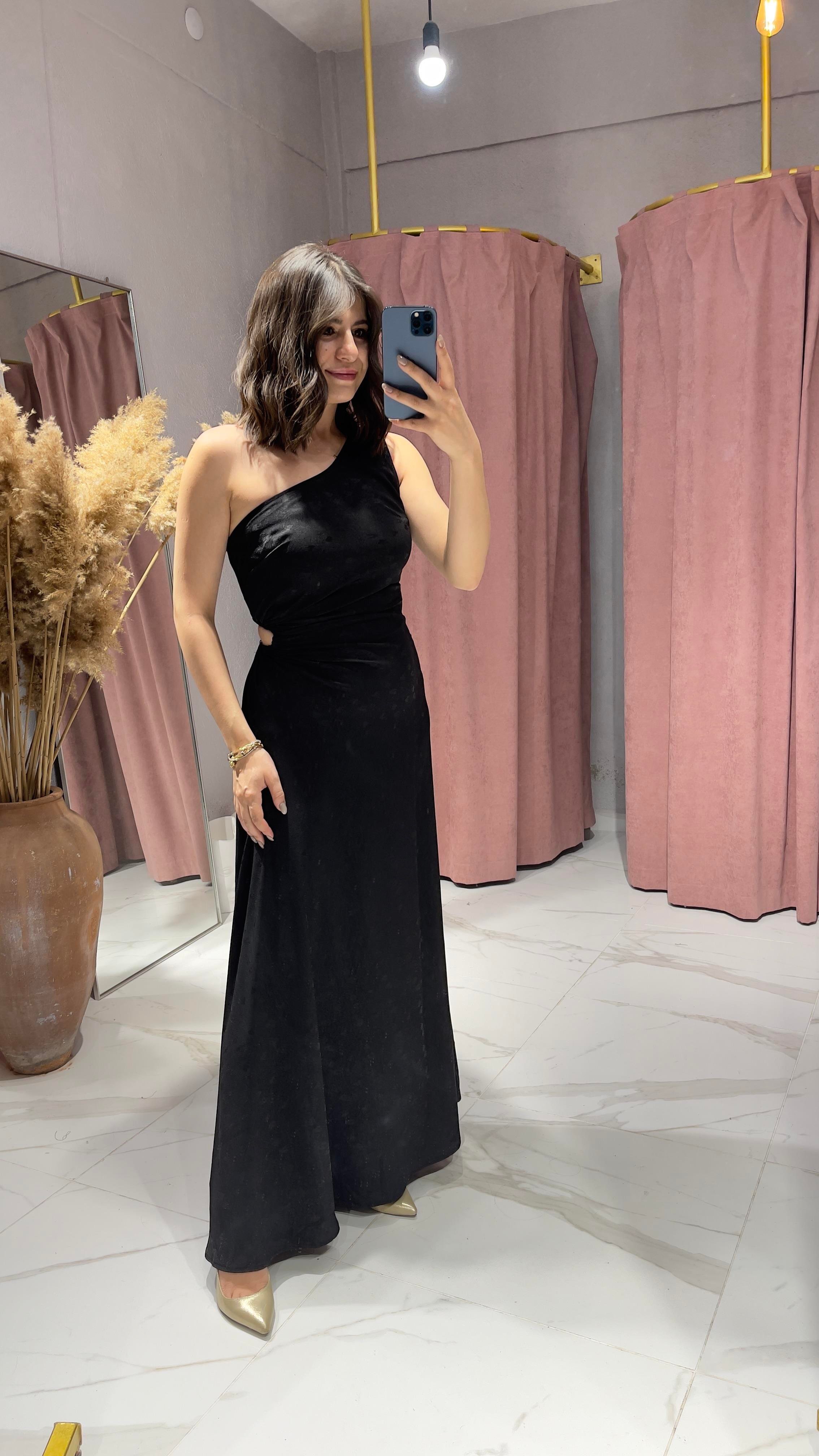 BEL DEKOLTELİ TEK OMUZ SİYAH SATEN ELBİSE