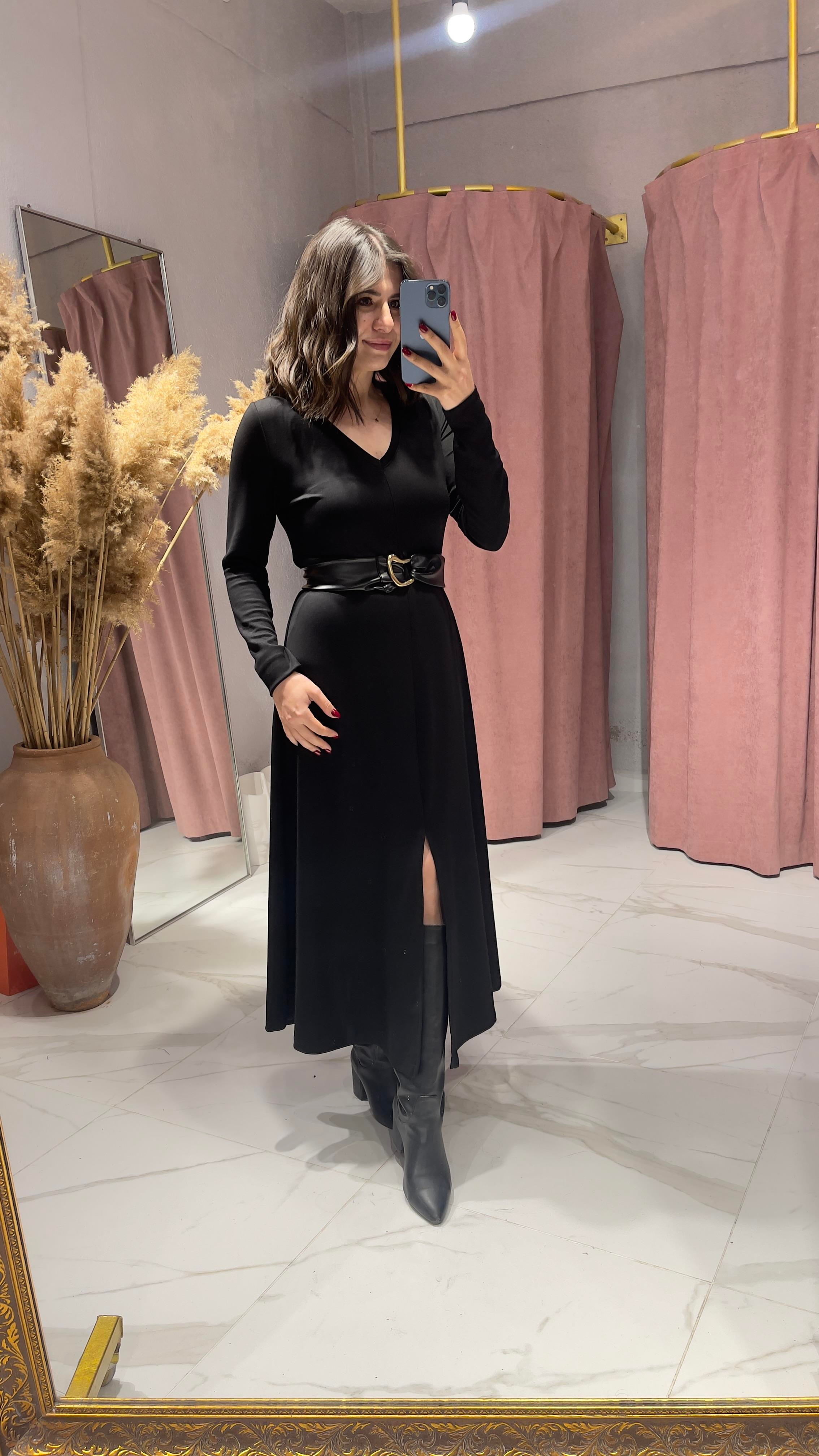 DERİ KEMERLİ YIRTMAÇLI SİYAH MODAL ELBİSE