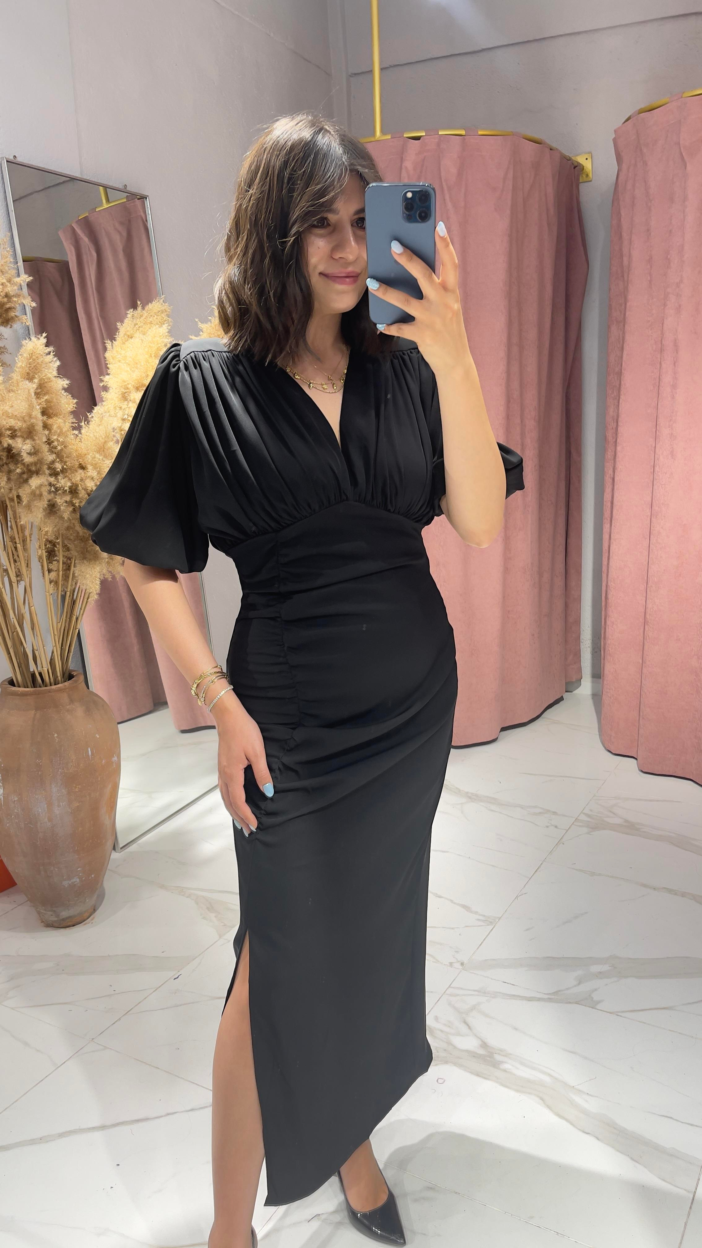 DRAPE DETAY YIRTMAÇLI SİYAH ELBİSE