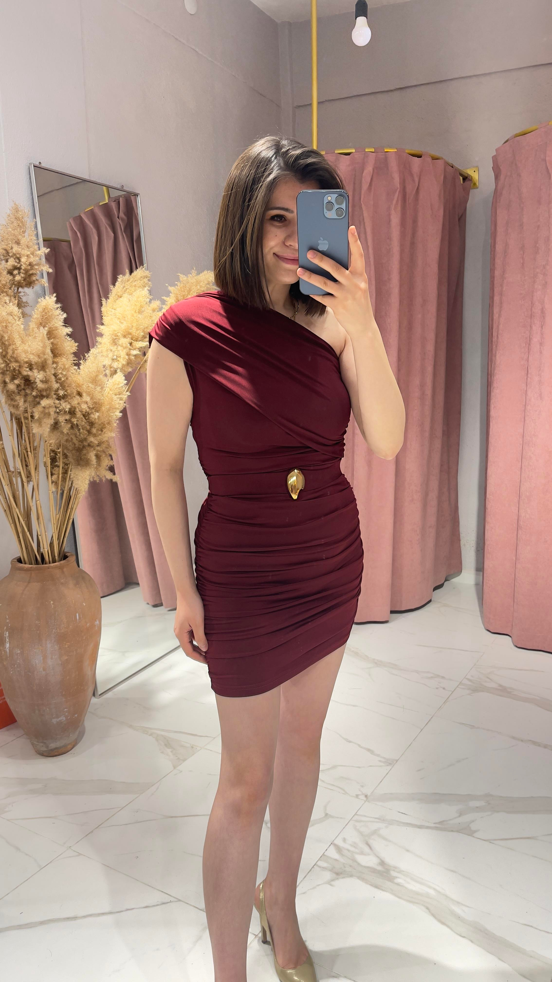 DRAPELİ GOLD TOKALI MADONNA YAKA MİNİ BORDO ELBİSE