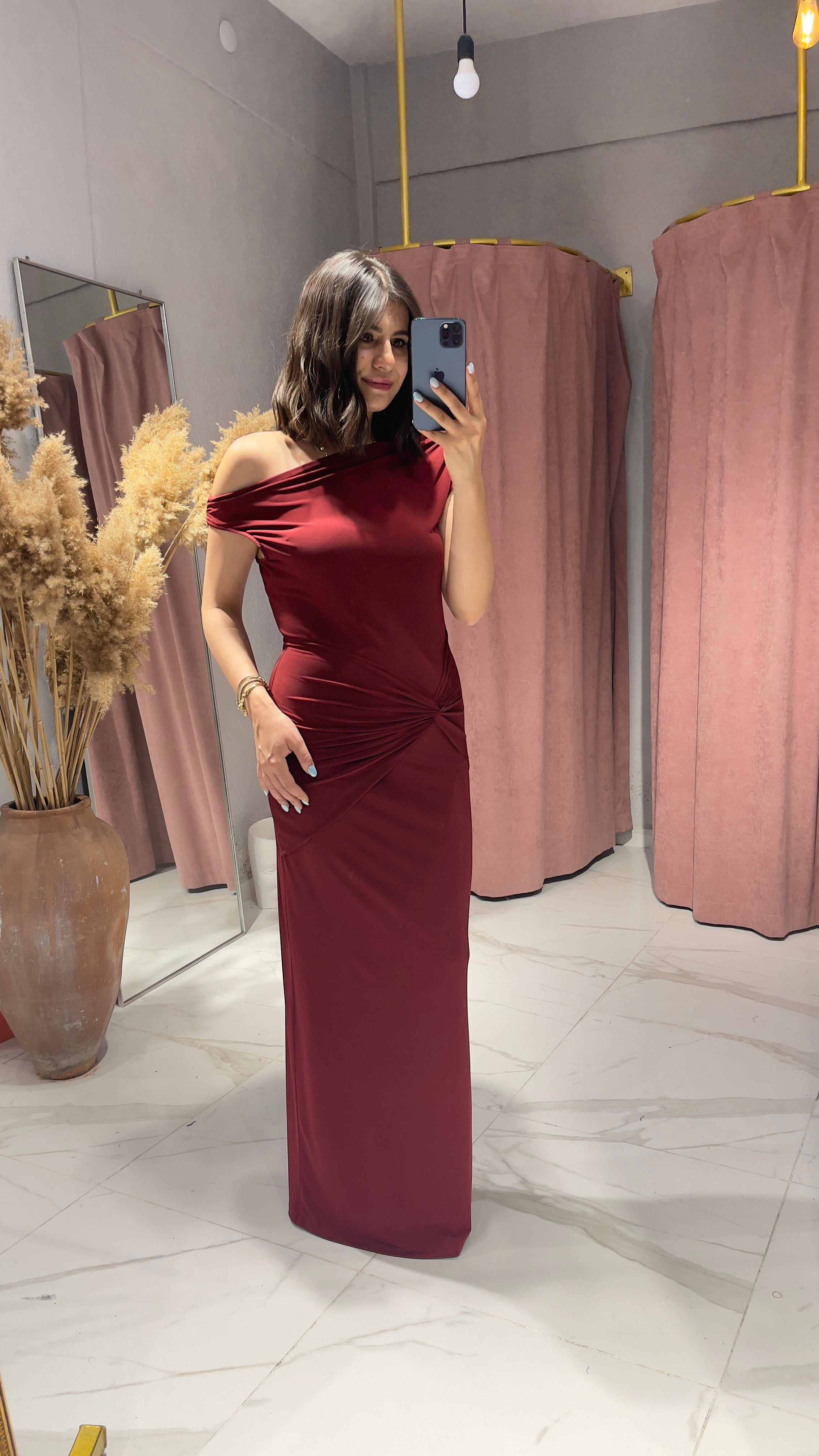 DÜŞÜK OMUZ YAN DÜĞÜMLÜ BORDO ELBİSE