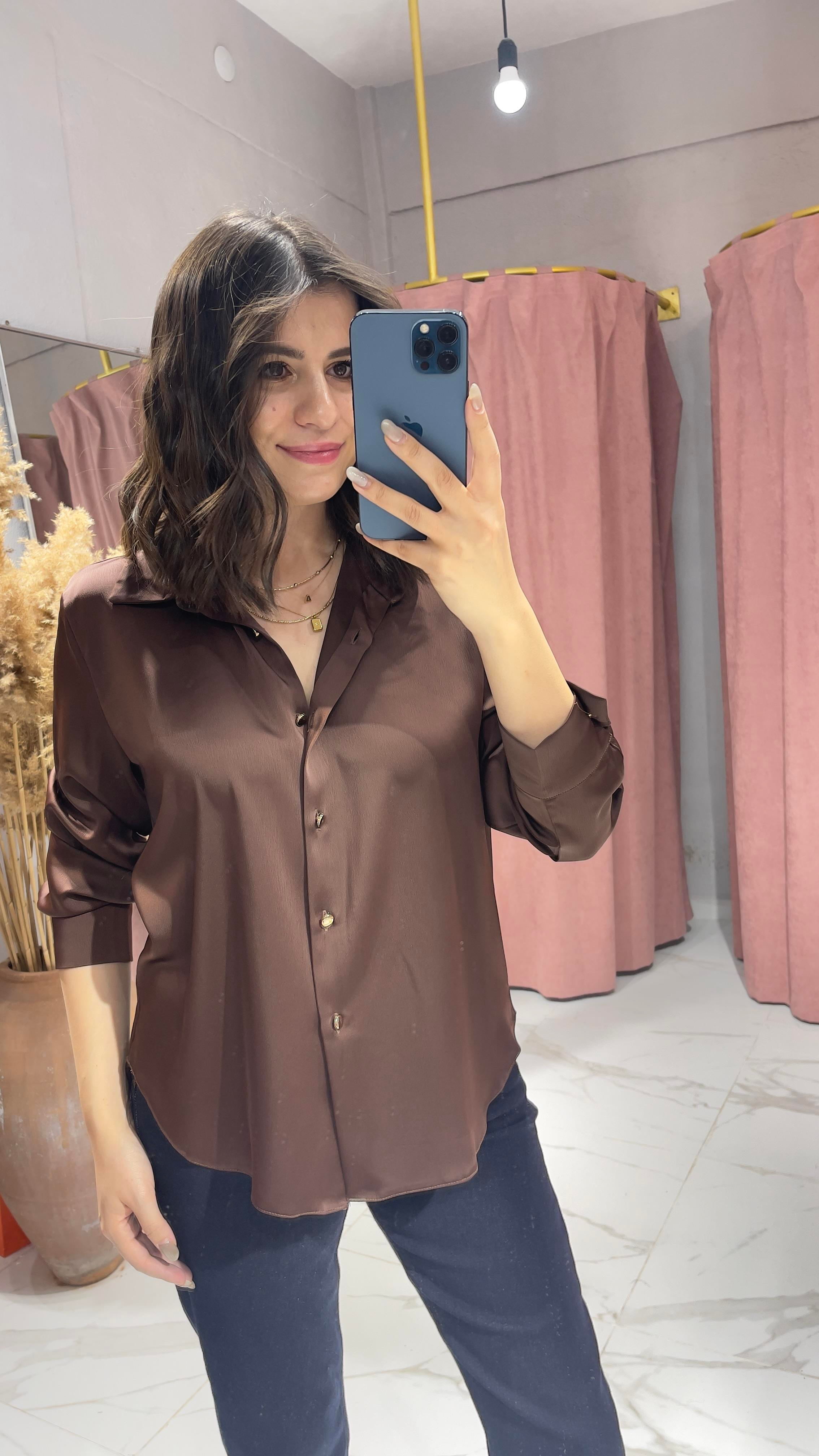 GOLD DÜĞMELİ KAHVE SATEN GÖMLEK