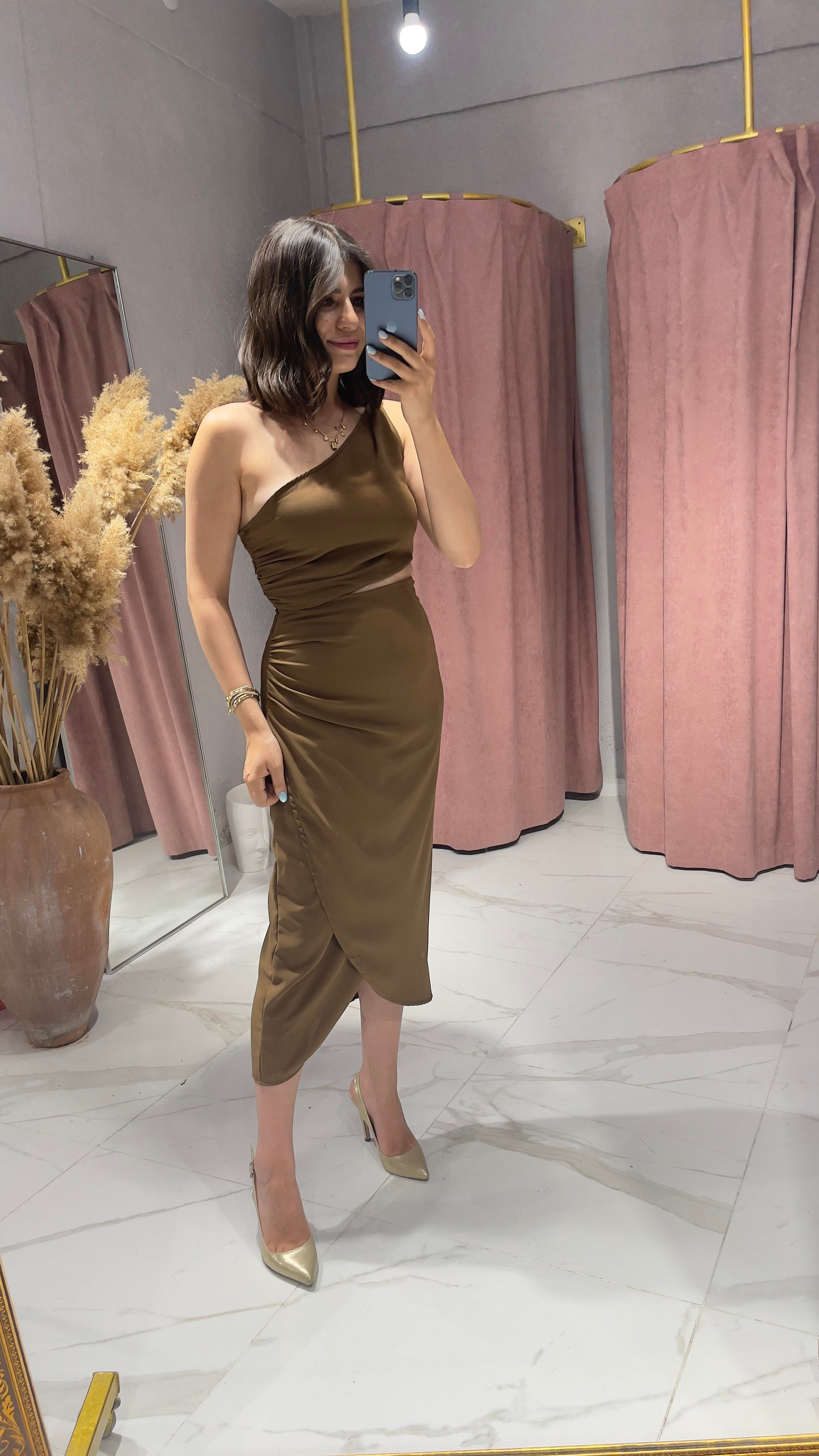 GOLD TOKA DETAYLI TEK OMUZ BEL DEKOLTELİ KAHVE ELBİSE