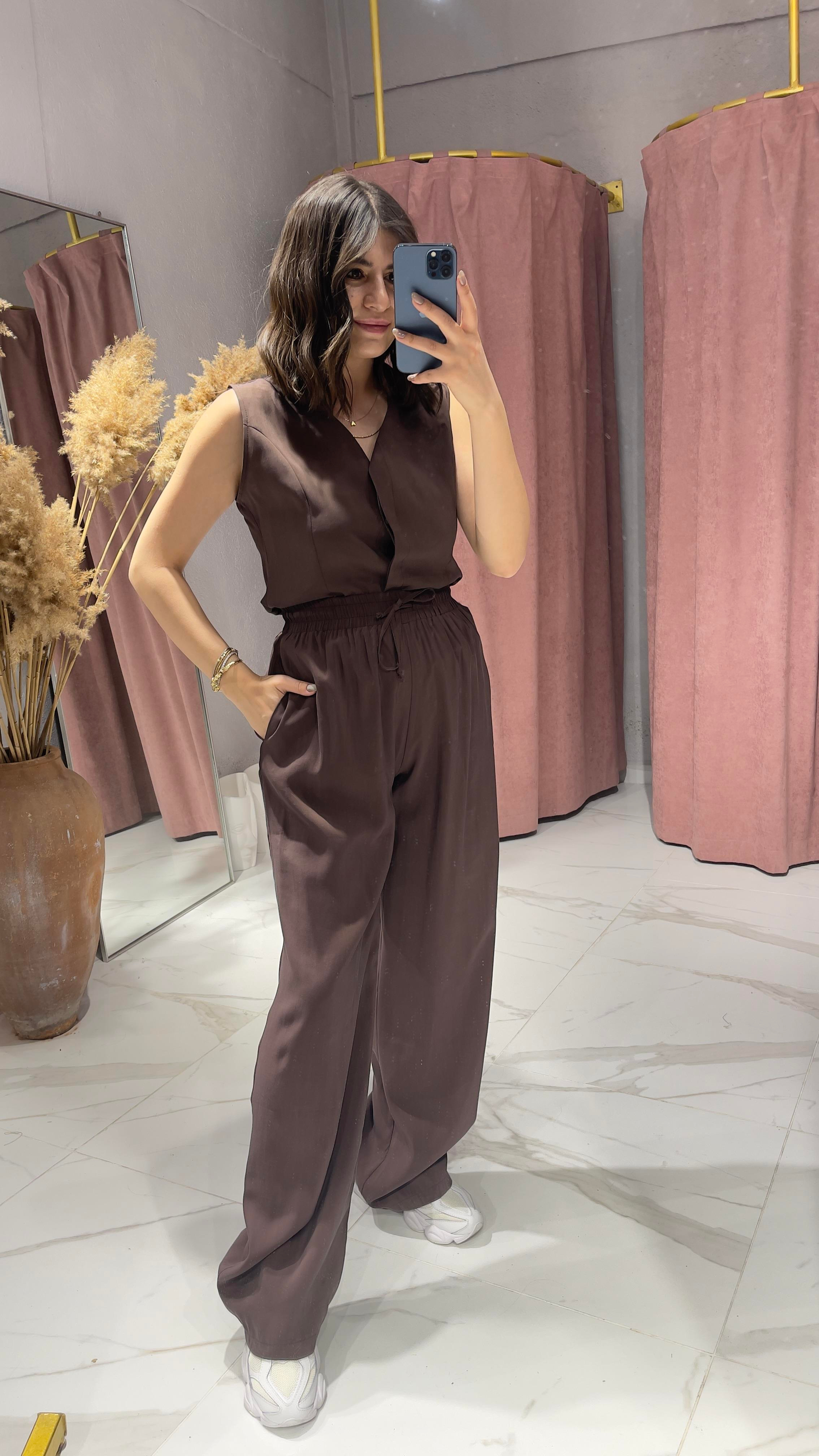 KAHVE TENSEL KUMAŞ KOLSUZ BLUZ PANTOLON TAKIM