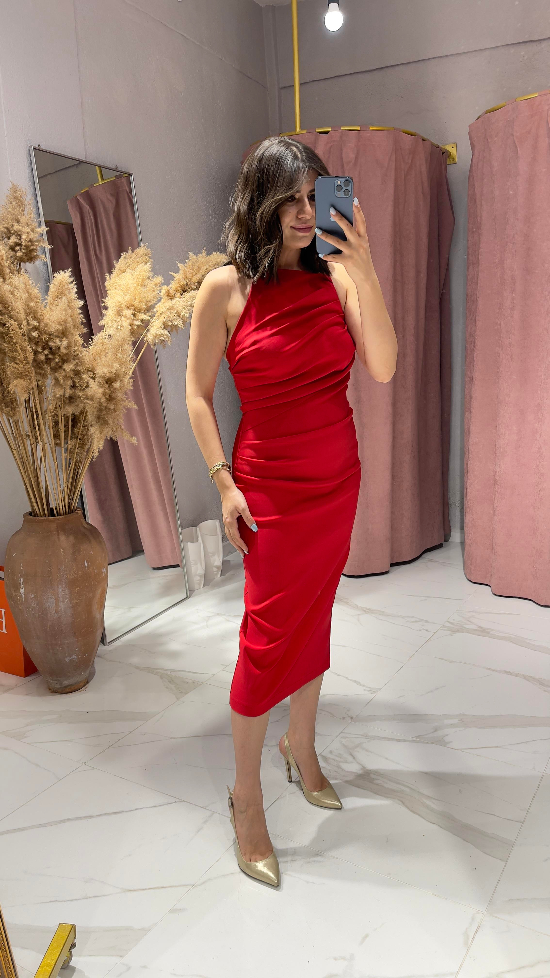 KIRMIZI DRAPELİ MİDİ ELBİSE