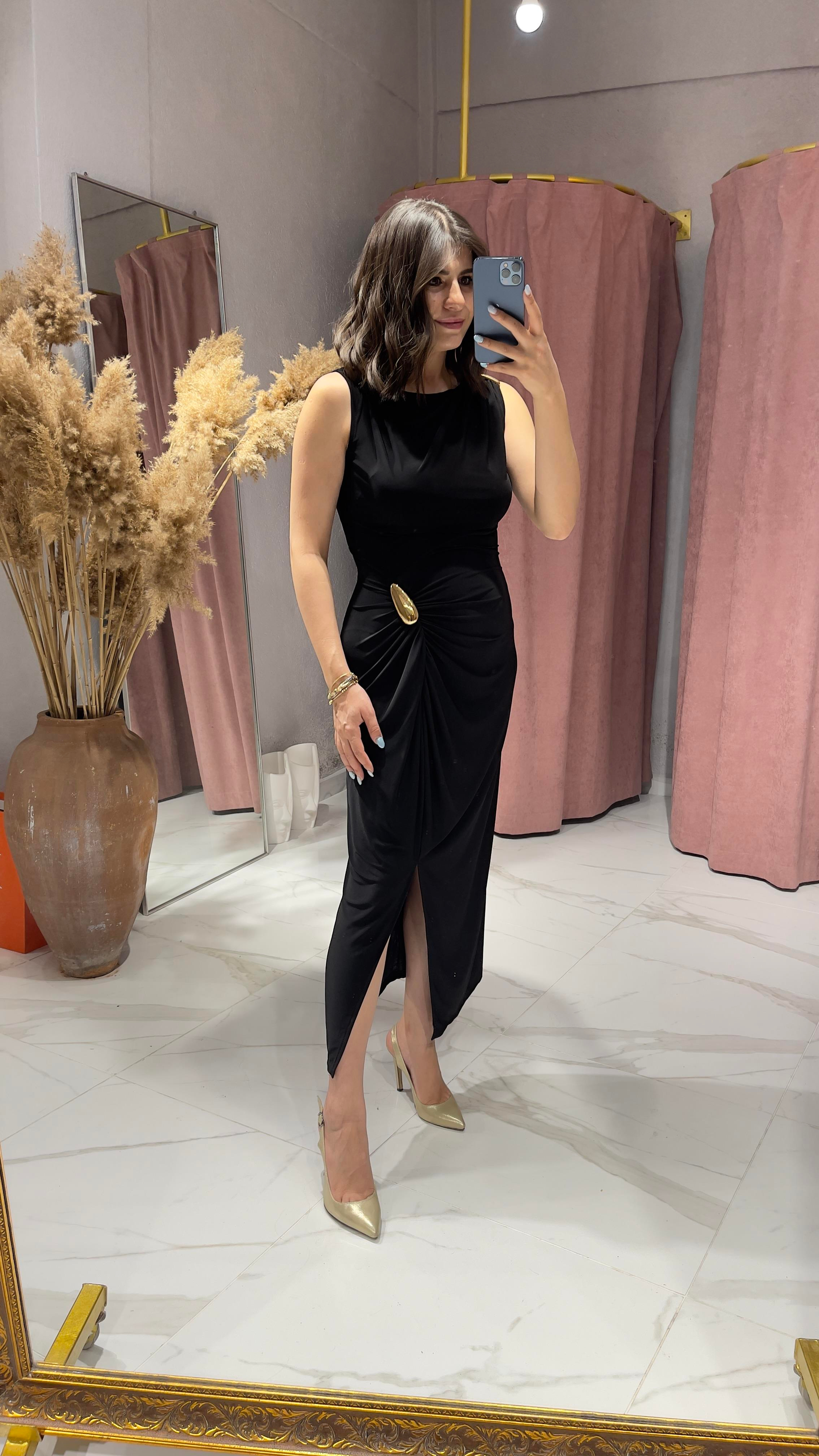 OMUZ VE BELDE GOLD TOKALI SİYAH MİDİ ELBİSE