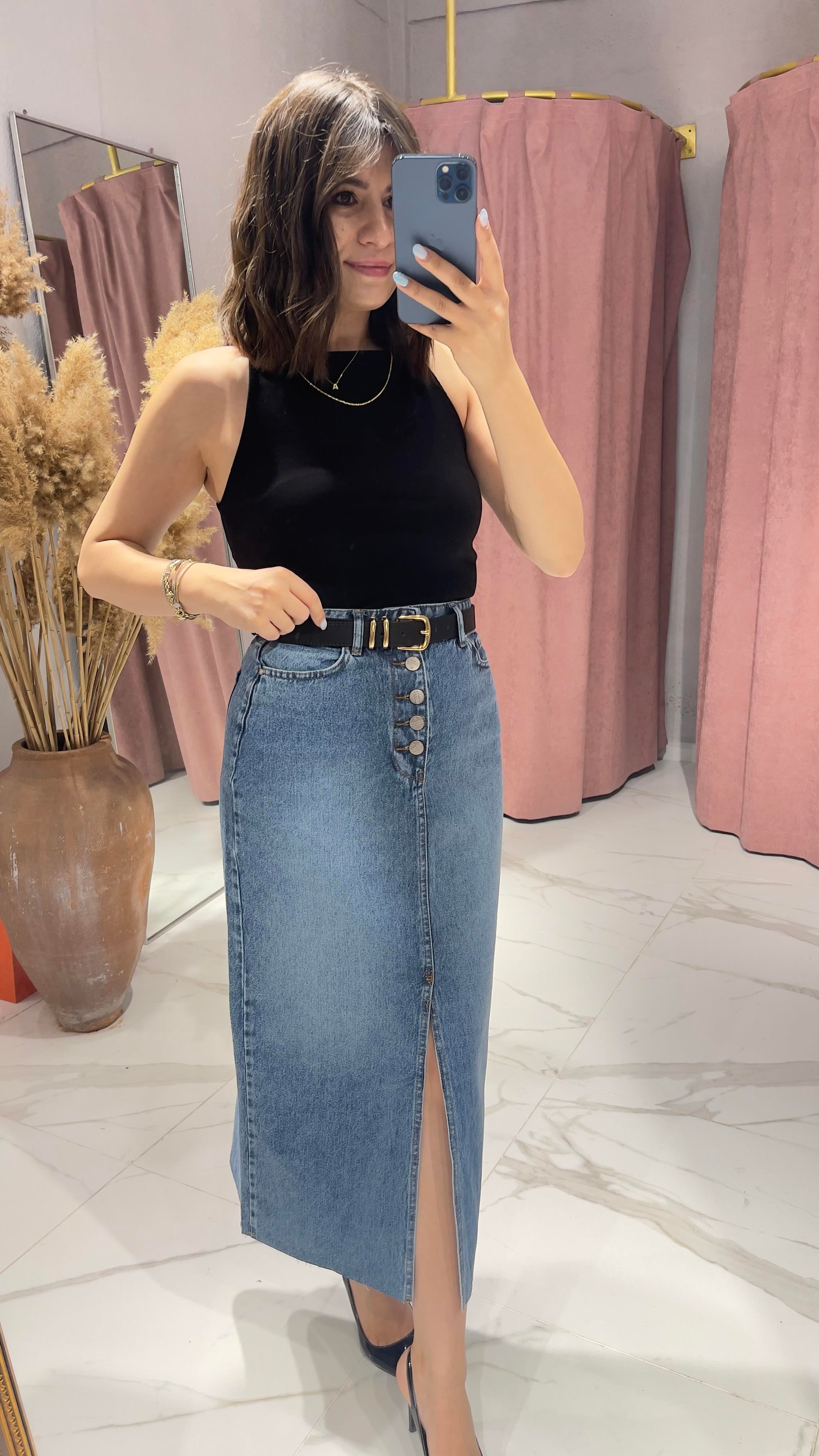 ÖN DÜĞMELİ YIRTMAÇLI PAÇA KESİMLİ MAVİ KOT ETEK