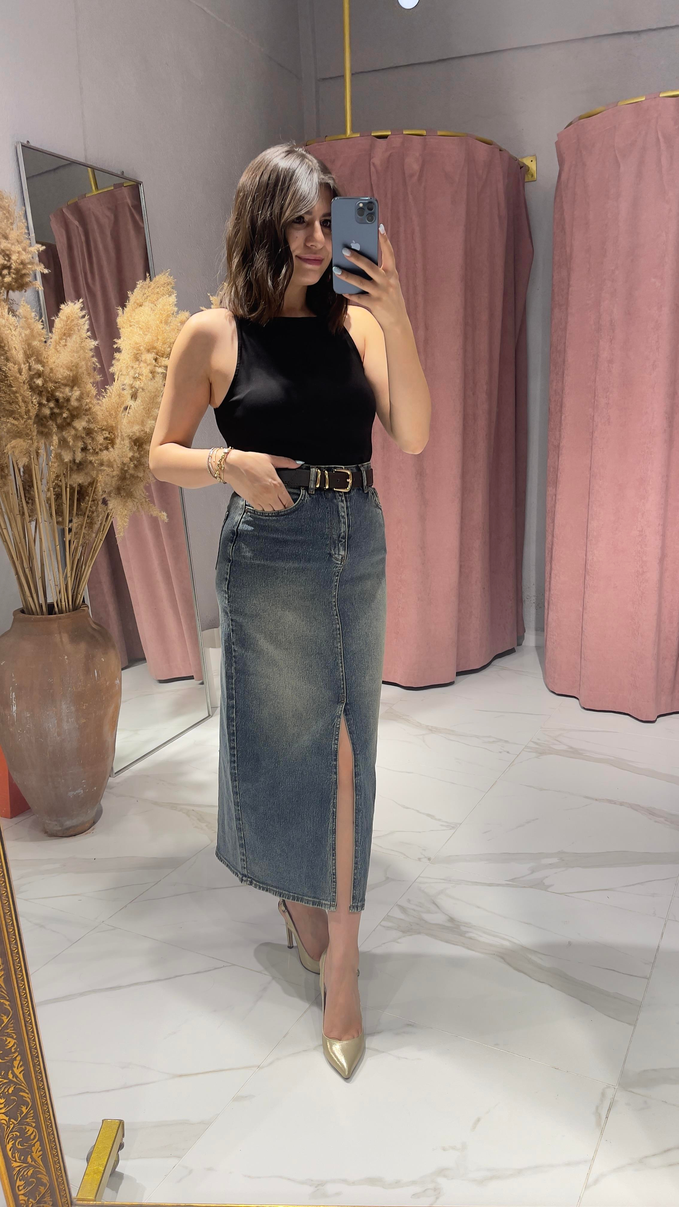 ÖN YIRTMAÇLI LACİVERT KOT ETEK