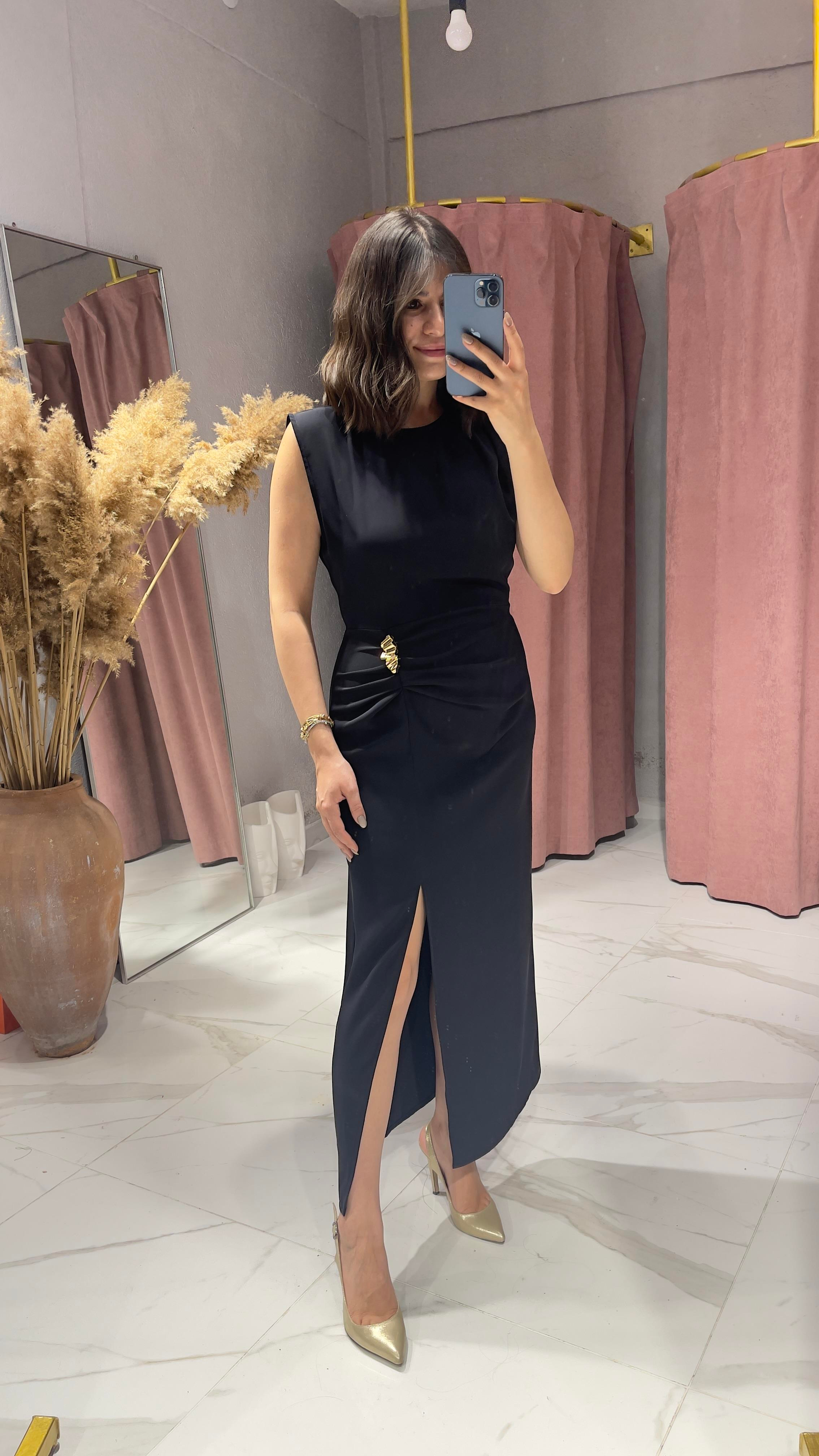 PİLELİ OMUZ BEL TAŞLI DETAYLI KISA KOL SİYAH ELBİSE