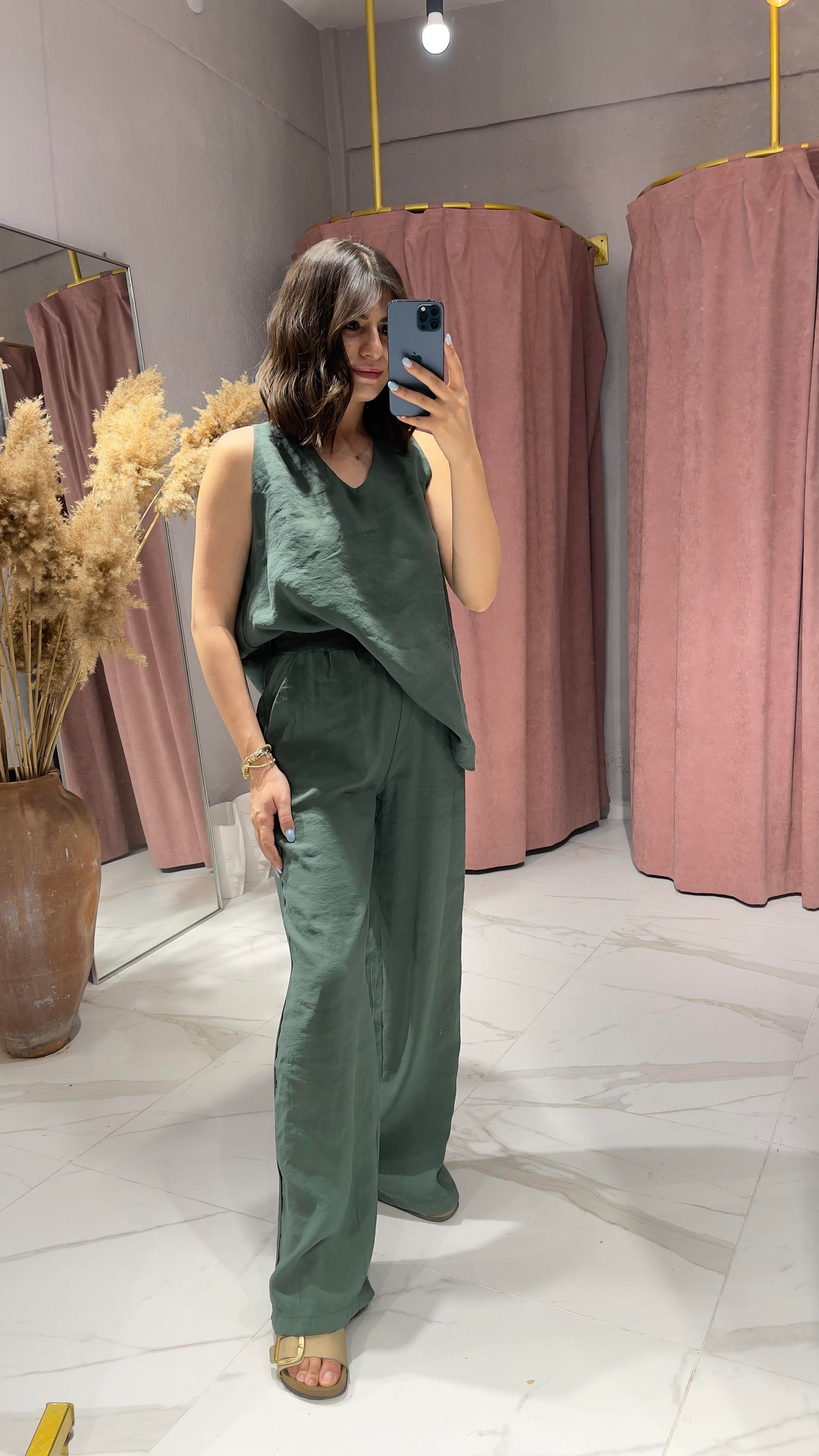 SIFIR KOL V YAKA BLUZ PANTOLON YEŞİL TAKIM