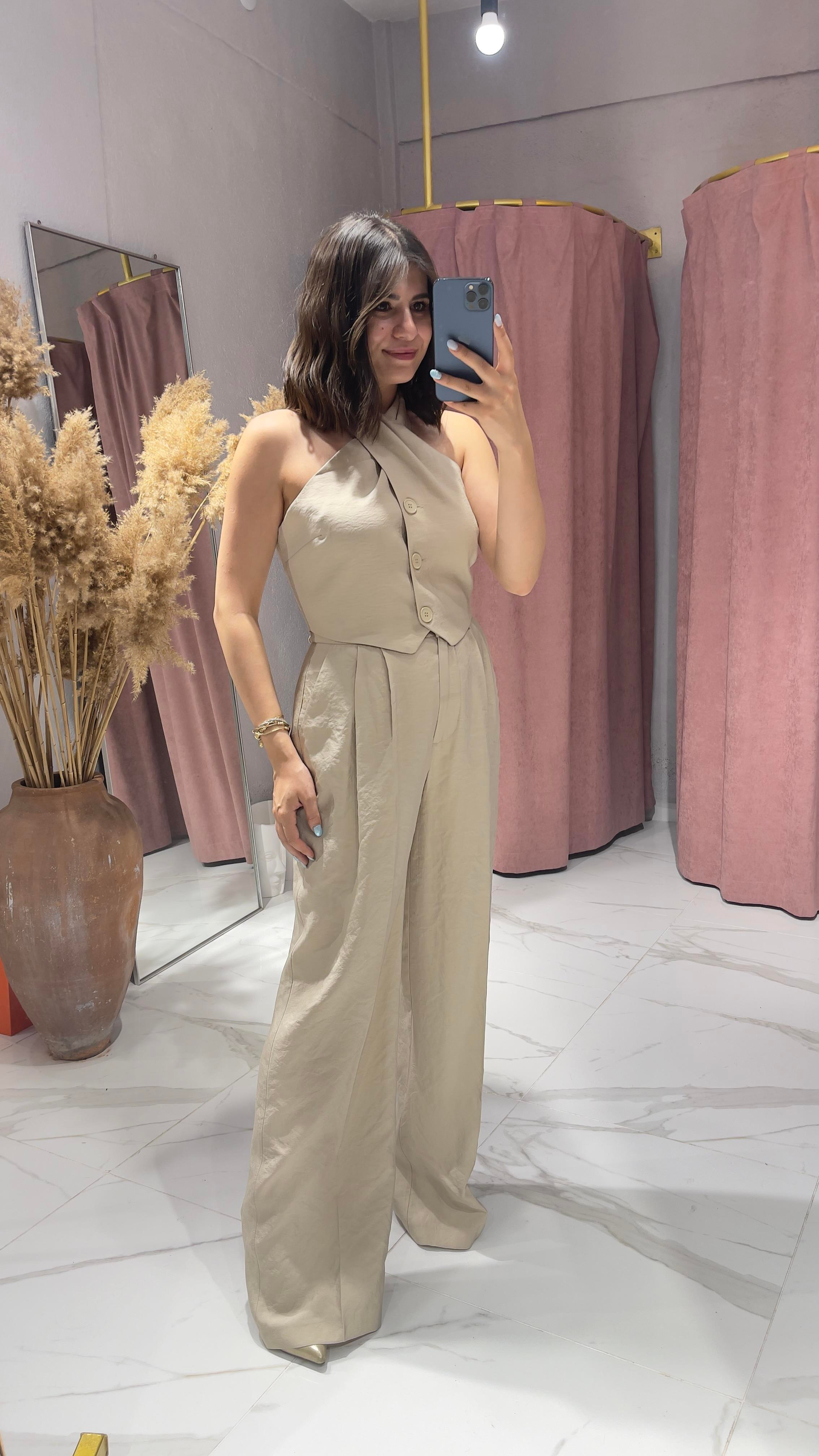 TENSEL KUMAŞ BOYUNDAN BAĞLAMALI YELEK PANTOLON BEJ TAKIM