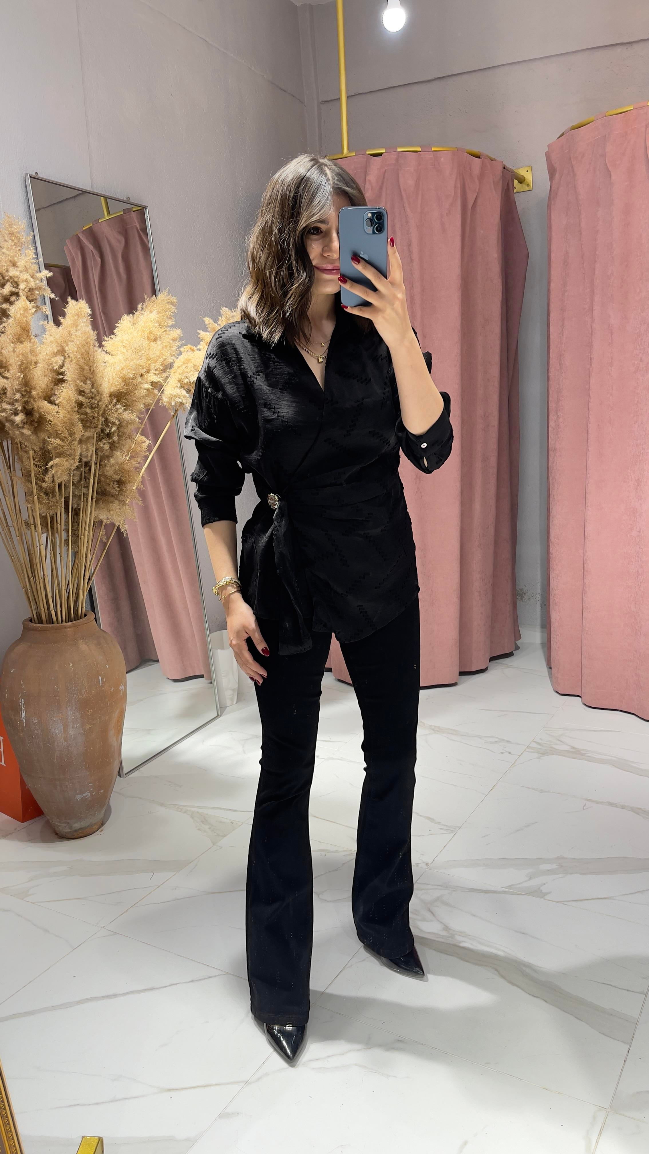 TOKA DETAYLI KRUVAZE SİYAH BLUZ