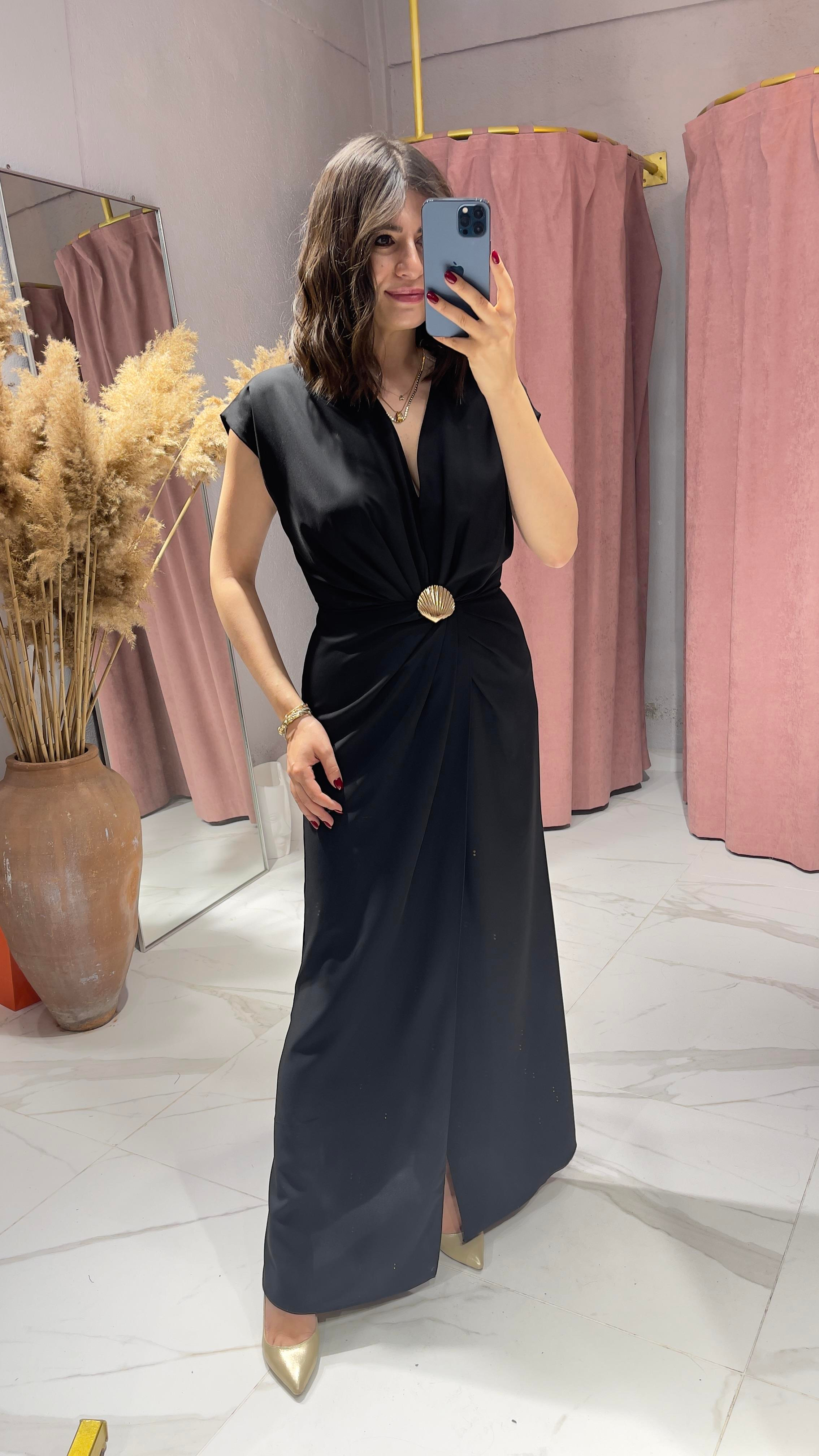 V YAKA GOLD MİDYE TOKA DETAYLI SİYAH MİDİ ELBİSE