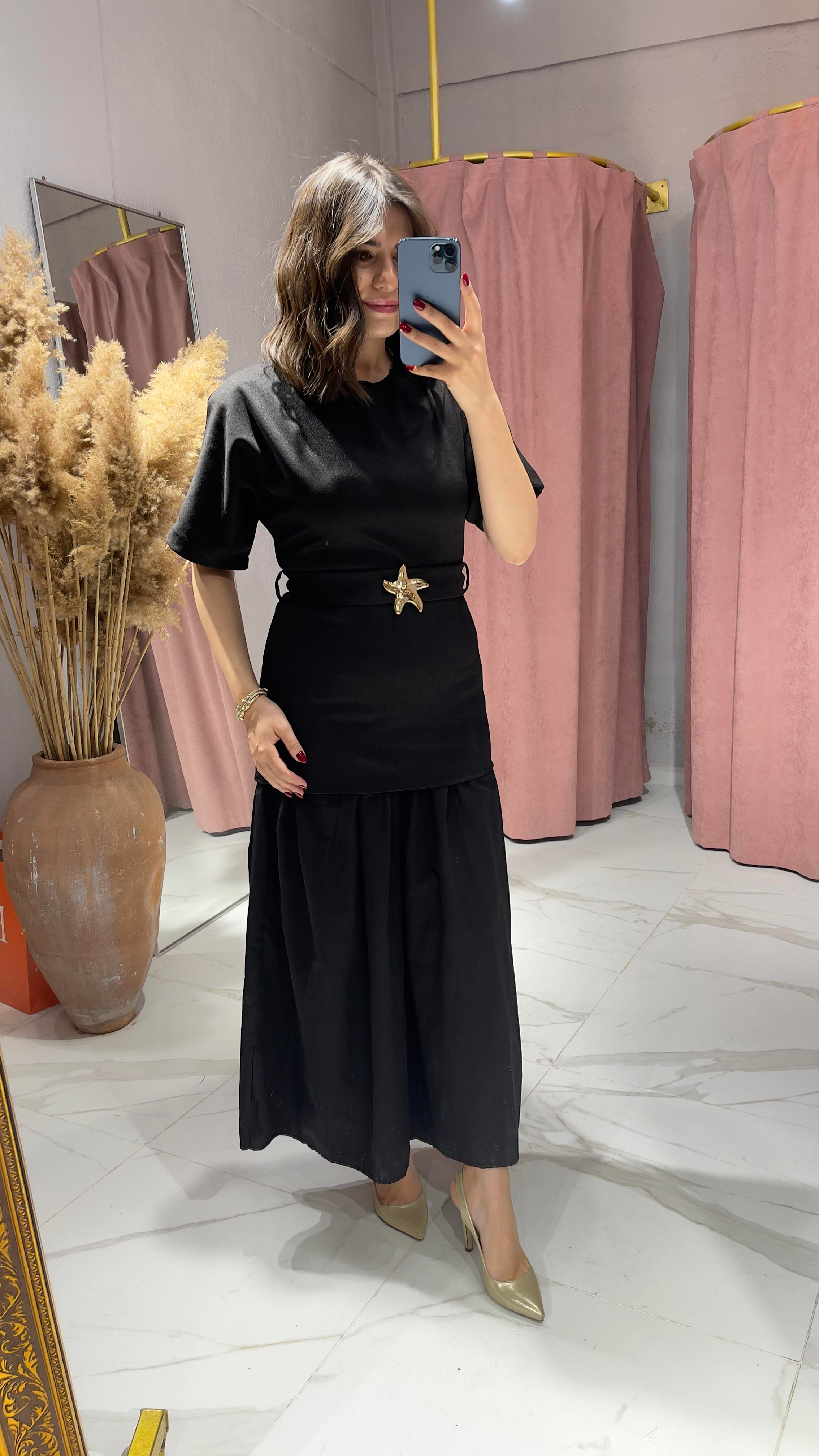 ZRA MODEL GOLD YILDIZ TOKALI ÇİFT KUMAŞ SİYAH ELBİSE