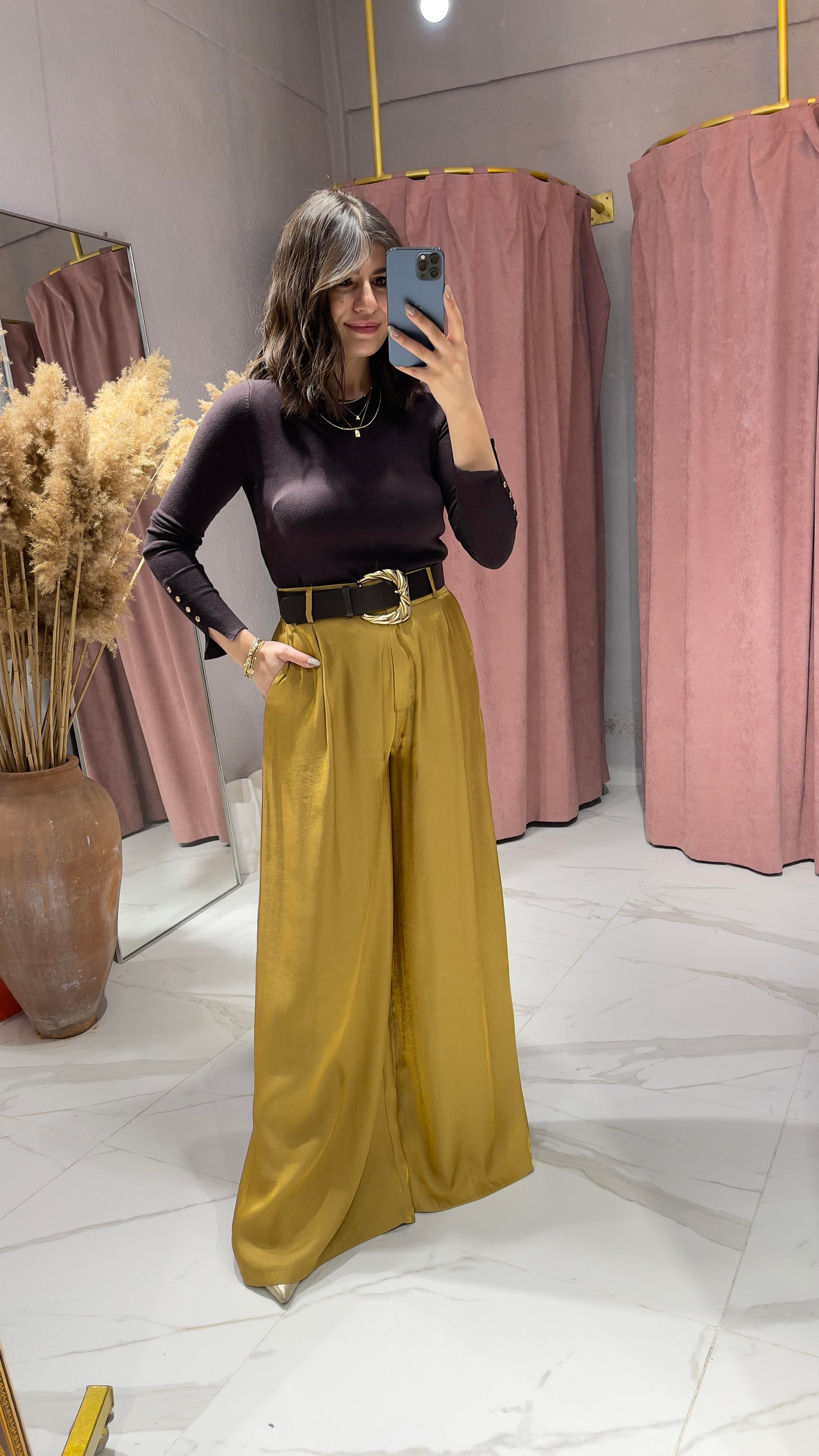 ZRA MODEL KEMERLİ İPEK KUMAŞ HARDAL PALAZZO PANTOLON